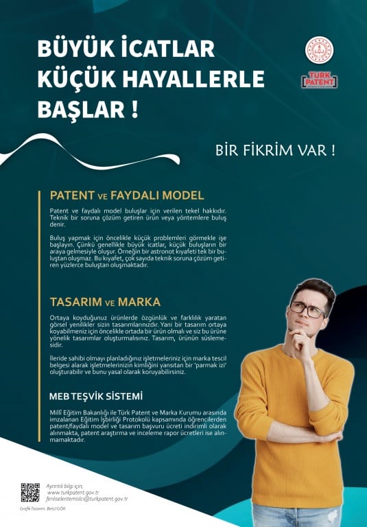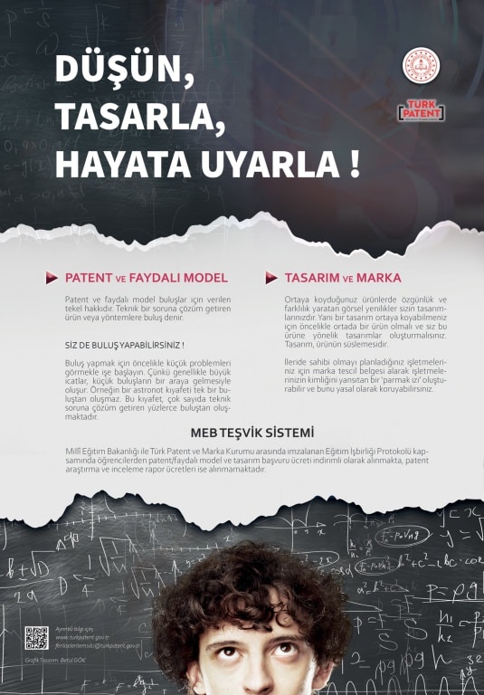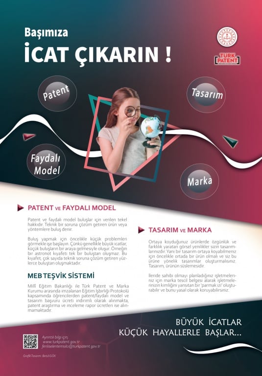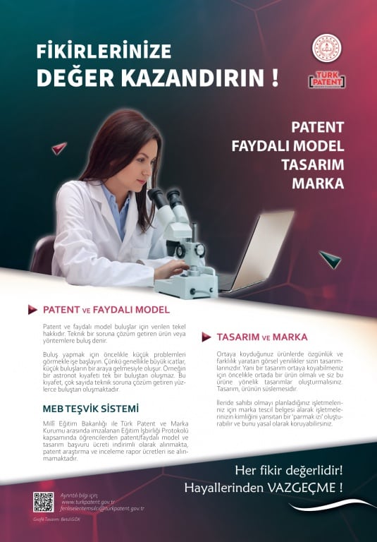 Milli Eğitim Bakanlığı ile Türk Patent ve Marka Kurumu arasında imzalanan Eğitim İşbirliği kapsamında öğrenciler, patent/faydalı model ve tasarım başvurularını aşağıdaki afişleri inceleyerek yapabilirler.